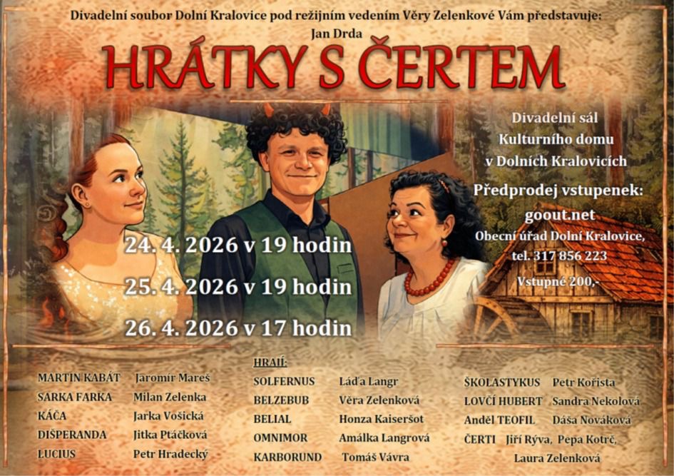 Divadelní soubor Dolní Kralovice představuje HRÁTKY S ČERTEM 24.4.2026 v 19.hodin 25.4.2026 v 19.hodin 26.4.2026 v 17.hodin